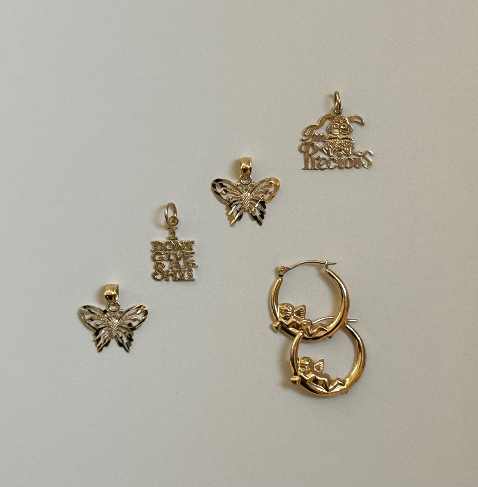 Pendants range in weight from .6 grams - .75 grams. Hoops weigh 1.12 grams, inner diameter is about 13mm, and have small signs of wear as they are preowned. Price will update automatically when you select your preferred item. ALL SALES FINAL.